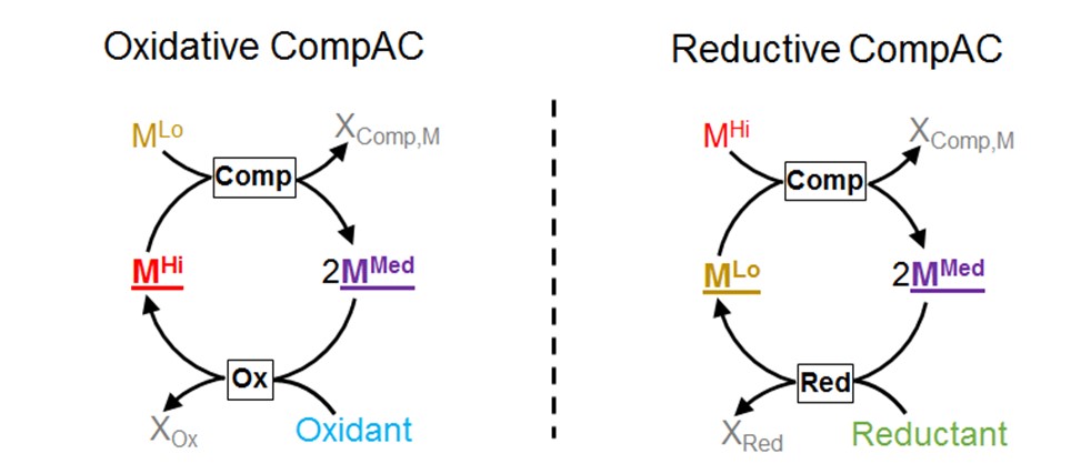 A CompAC is a Comproportionation-based Autocatlytic Cycle. It is formed by joining a comproportionation reaction with an auxiliary oxidative (left) or reduction (right) reaction that connects outputs with inputs. Each time the comproportionation reaction occurs, at least 2 intermediate-state species are generated. In this way, a CompAC forms an autocatalytic loop of reactions that amplifies the intermediate-oxidation-state species and, indirectly, the other species that form the cycle.